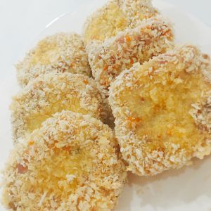 拌好的土豆泥捏成形状,先裹上淀粉,再裹上蛋液,再裹上面包糠。用锡纸包好烤盘,上面刷一层橄榄油,摆入可乐饼,每块上顶块黄油,会比较香。