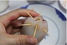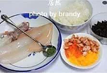 鱿鱼洗干净,用姜片料酒腌制备用,火腿切粒,甜椒切粒,红萝卜切碎,木耳切碎