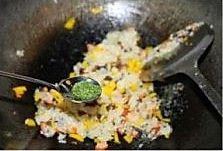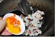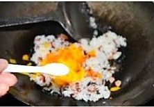 加入米饭炒散后,倒入黄甜椒,黑木耳,红萝卜,炒均匀,