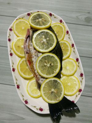 先把鱼洗净,横刀摸点适量盐,铺上柠檬。