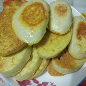 把切好的馒头放一片到搅拌均匀的鸡蛋里,两面都沾上鸡蛋,把馒头放到电饼铛里
