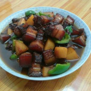 等肉块均匀上色后加入适量热水,(一定用热水!)炖五十分钟后加入土豆、盐再炖十五分钟加入青椒出锅!(口味喜甜的可加点糖,以个人而定!)