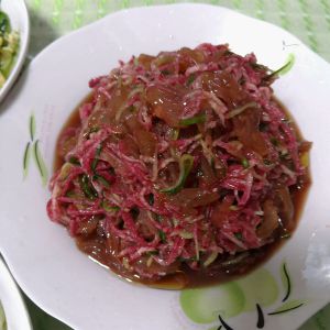 到入海蜇丝加醋 糖 耗油拌匀,静置一会