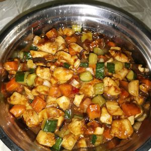 锅里放少许油,放入花椒,炒出味道后捞出,放入辣椒葱白,翻炒出香味,加入一勺豆瓣酱,翻炒出红油,放入胡萝卜香菇黄瓜翻炒均匀,加入鸡丁翻炒,倒入对好的料汁,翻炒均匀,即可盛出