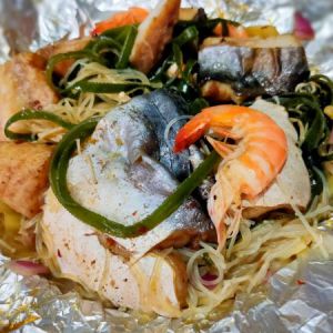 空气炸锅200度,15分钟后,轻轻移开上层的鱼肉,腾出一小块空间,倒入泡好的粉丝,此时鱼肉已经熟了,可以稍微尝一下,根据个人口味需要再用清水调一点糖和盐水倒入,让配菜继续入味