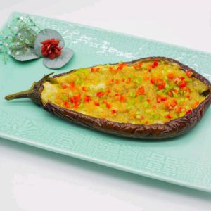 将茄子从中间切开,倒入大蒜酱,这个酱汁使用的是山东大蒜熬制