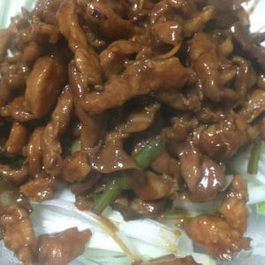 热锅凉油,下入八角五秒后下入肉丝。肉丝炒至变色断生,倒少许生抽、糖(根据个人口味决定多少)、盐(根据个人口味,我口淡就没加)调味。倒入化好的酱汁炒香。再倒入葱姜水(不宜过多)稍微煮几分钟。