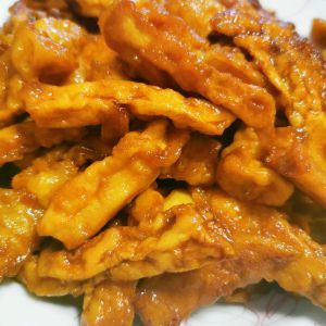 炸好蘑菇后,调汁(糖,盐,醋,耗油,酱油),收汁后就可以了!酸酸甜甜的!