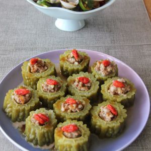加泡好的枸杞放在苦瓜酿肉上面点缀装饰。完成啦