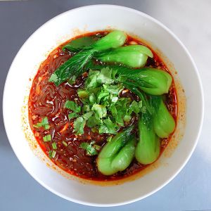 1、土豆粉泡软、油菜洗净中间一刀开半备用;