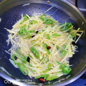 倒入不带水的土豆丝,依次加入白醋,海鲜酱油,蚝油,盐,糖即可炒3分钟,出锅前倒入蒜沫,扒拉几下即可出锅
