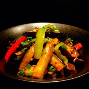 待汤汁略稠时下入茄子和辣椒段,开大火翻炒至均匀包裹好茄子
