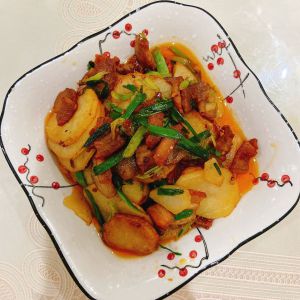 五花肉有稍许发黄,倒入土豆,继续翻炒,过程中不加水