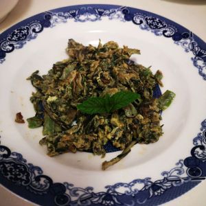 锅热 放入菜籽油 稍稍冒烟 倒入香椿鸡蛋 慢慢翻炒