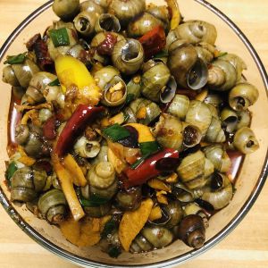 放入豆瓣,爆香后倒入洗干净的田螺,翻炒