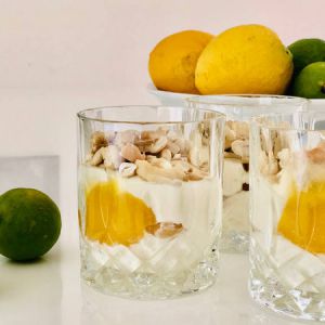 将各层按以下顺序浇入杯中:打发好的奶油、柠檬凝乳、手指饼干、柠檬凝乳、打发好的奶油。顶上撒一些烤腰果和柠檬皮碎。尽情享用吧!