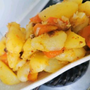 最后撒入孜然粉和蒜末,炒至土豆表面干干的,粘了很多渣就可以了。