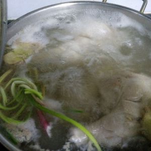 鸡腿、姜片、葱结、下锅倒点料酒,大火煮20-30分钟