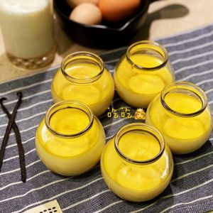 稍等片刻将刚刚放凉的布丁液慢慢注入瓶中。烤盘加水,烤箱预热,160度