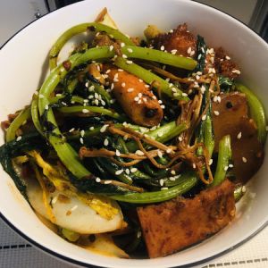 最后加入最容易熟的青菜,蒿子杆,菠菜,素丸子等翻炒均匀。