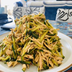 将黄瓜洗净切丝,鸡胸肉撕成丝细备用