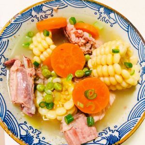 锅中倒入切块的甜玉米,胡萝卜,葱段,姜片