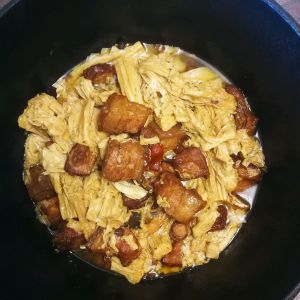 哇~热气腾腾、色香味俱全的腐竹烧五花肉出锅啦!