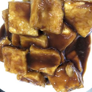 调小火,把调好的糖醋汁搅拌均匀倒入锅中,快速翻炒,使料汁能够均匀的将豆腐包裹住。