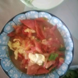 锅内倒油,烧热,放入葱花暴香,下入西红柿,放入少许盐,让它出汁,之后放一点生抽