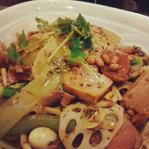 放入食材,顺序按不好熟的到好熟的顺序。每放一样就炒几下,让食材裹上酱料