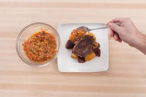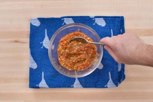 将甜椒番茄酱放在小碗中。加入开心果碎、雪莉醋和一小勺油。搅拌匀均,根据各家口味加入盐和少许黑胡椒粉调味。