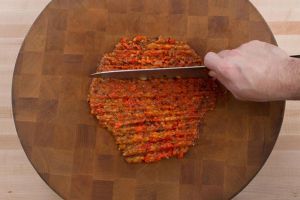 将出烤箱的大蒜粒、番茄和红甜椒一起在干净的砧板上剁碎制成西班牙甜椒番茄酱。又称Romesco Sauce。