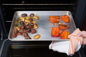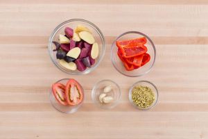 把大蒜粒、红甜椒、番茄放在烤盘的一侧,土豆放在另一侧。在每个蔬菜上均匀撒上食用油和少许食盐,胡椒粉和甜椒粉,烤22-24分钟(根据各家烤箱情况,不要烤焦)至蔬菜软化成熟。取出放凉待用。