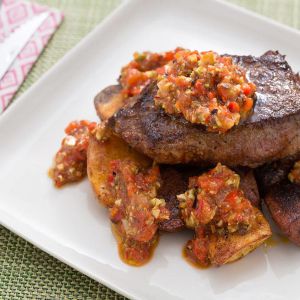煎牛肉配西班牙甜椒番茄酱汁佐烤土豆菜谱做法