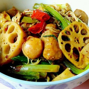 热油放海底捞调料炒,所有食材放入一起炒,出锅前加糖盐等调味