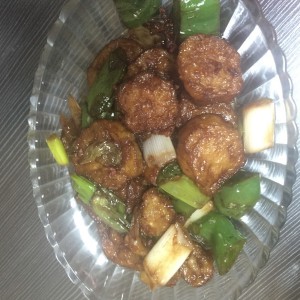 锅里留少许油,放花椒、葱、姜小火翻炒数下后,转中火倒入炸好的茄子,放酱油,生抽,糖,添适量水,放辣椒。小火炖