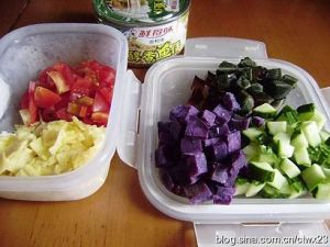 鸡蛋打散,加一点盐花,摊成蛋皮,冷却后切小丁;小番茄洗净,用开水泡一下,切成小丁; 黄瓜洗净,用温开水冲洗干净,切成小丁;紫薯蒸熟,待冷却后切成小丁;皮蛋剥开,切成小丁;金枪鱼醇香鱼伴打开待用;葱切葱花。