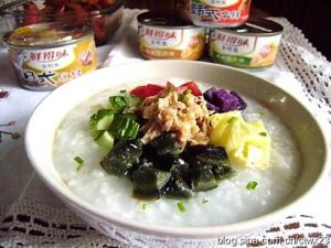 盛出粥,依次放上紫薯、蛋皮、黄瓜、小番茄、皮蛋,当中放上金枪鱼醇香鱼伴