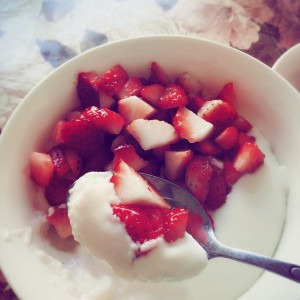 蒸好后再闷10分钟。将草莓切成如图的小丁状
