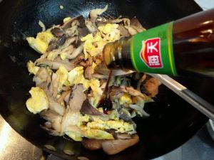 平菇水分基本炒干,加鸡蛋少许耗油,继续翻炒