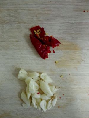 大蒜切片,干辣椒备用