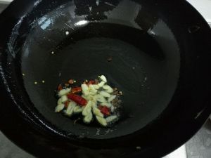 锅里放油加热,放切好的大蒜和辣椒炒出香味