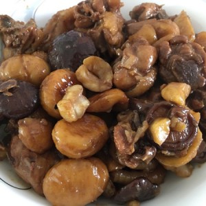放入板栗,香菇,加热水,对比,食材,大火煮。