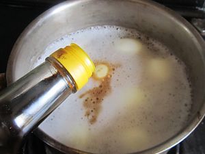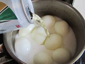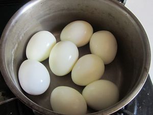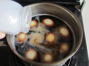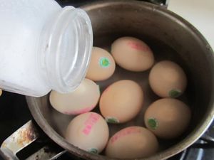 这样能很方便的将鸡蛋壳剥去, 将去壳的鸡蛋放在锅中;
