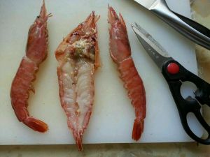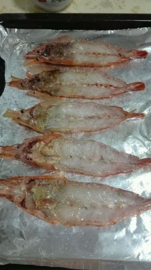 大虾剪去虾须和腿,用剪刀剪开虾背再用刀片开虾肉,掰开虾壳平铺开