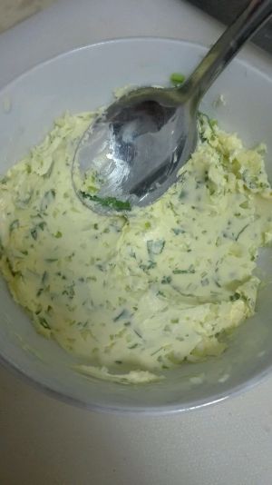 黄油室温软化,将切好的蒜末和香菜末放入黄油中拌匀备用。(如果家里温度低黄油不软化可以微波15秒)