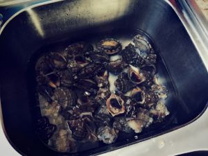 买回来的海螺洗净,放盐水里泡半到1个小时,目的是为了让它吐沙。锅内接水放姜片下海螺。