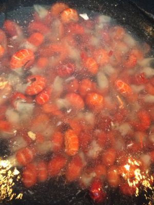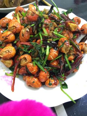 葱姜蒜干辣椒爆锅。放入虾大火爆炒,香菜后放入炒一会就可以。出锅。辣辣的爽