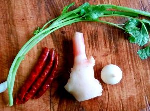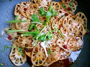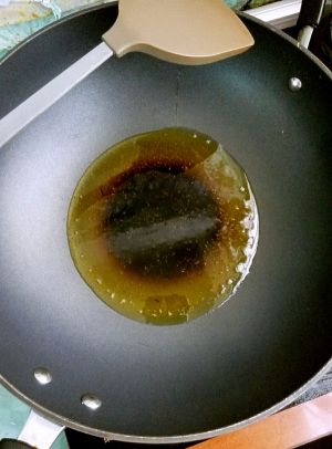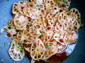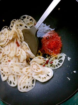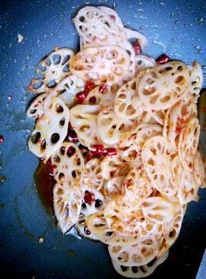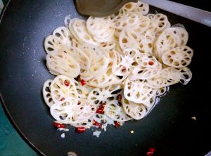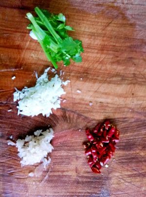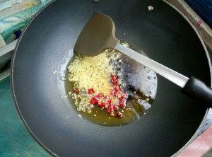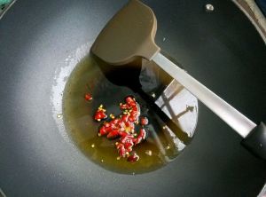 干辣椒段稍炸香,继续放入姜蒜末炸香