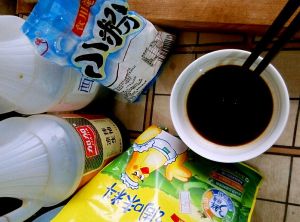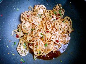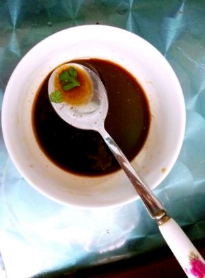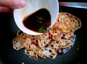 碗汁儿里有一茶匙生抽,一茶匙香醋,一茶匙白糖,几滴花椒油,少许鸡粉,少许盐,最后半茶匙淀粉,调匀备用